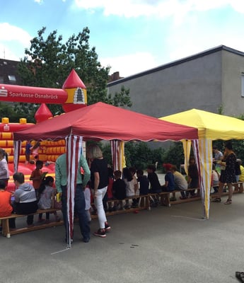 Bei bestem Wetter feierten wir heute unser Schulfest. Zu Beginn begrüßte die Schulleitung die zahlreichen Gäste und die Kinder präsentierten ihre Ergebnisse aus der Projektwoche. Anschließend konnten sie sich u.a. auf der Hüpfburg austoben und ihr Geschick auf der Slackline ausprobieren. Zudem waren Kaffee, Tee und Kuchen in der Cafeteria zu erwerben und der Flohmarkt bot Gelegenheit Schnäppchen zu finden.