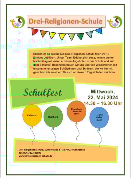 Am 22.05.2024 von 14.30 bis 16.30 Uhr findet anlässlich unseres 12-jährigen Jubiläums unser Schulfest statt. Mit Cafeteria, Hüpfburg und vielen weiteren tollen Mitmachangeboten sind alle Schülerinnen und Schüler, Eltern, Geschwister, Großeltern und ehemalige Schülerinnen und Schüler und Wegbegleiter herzlich eingeladen!